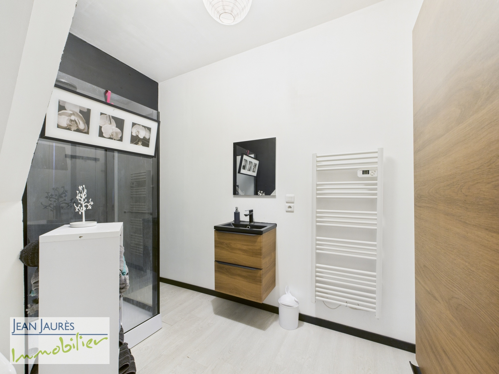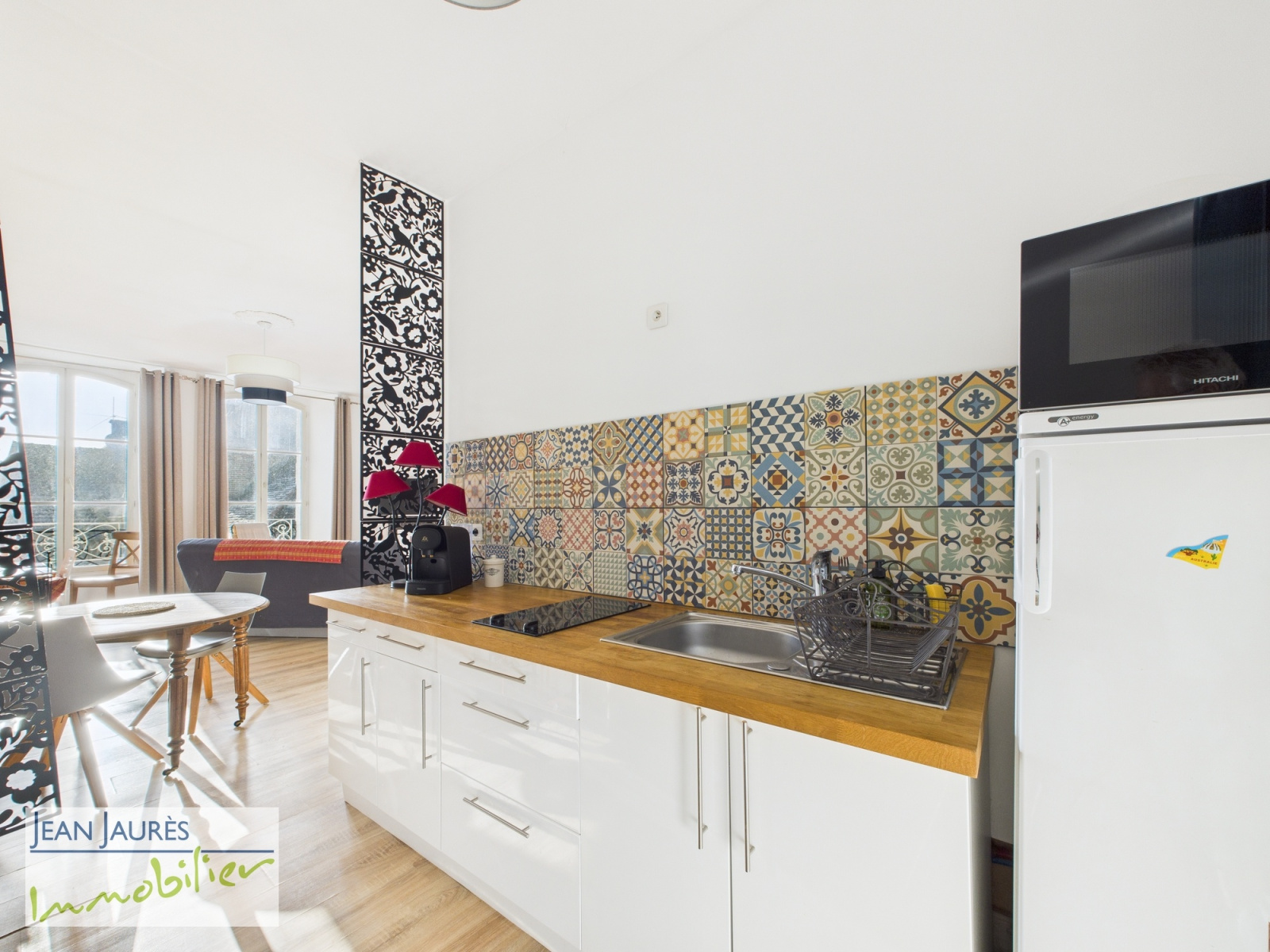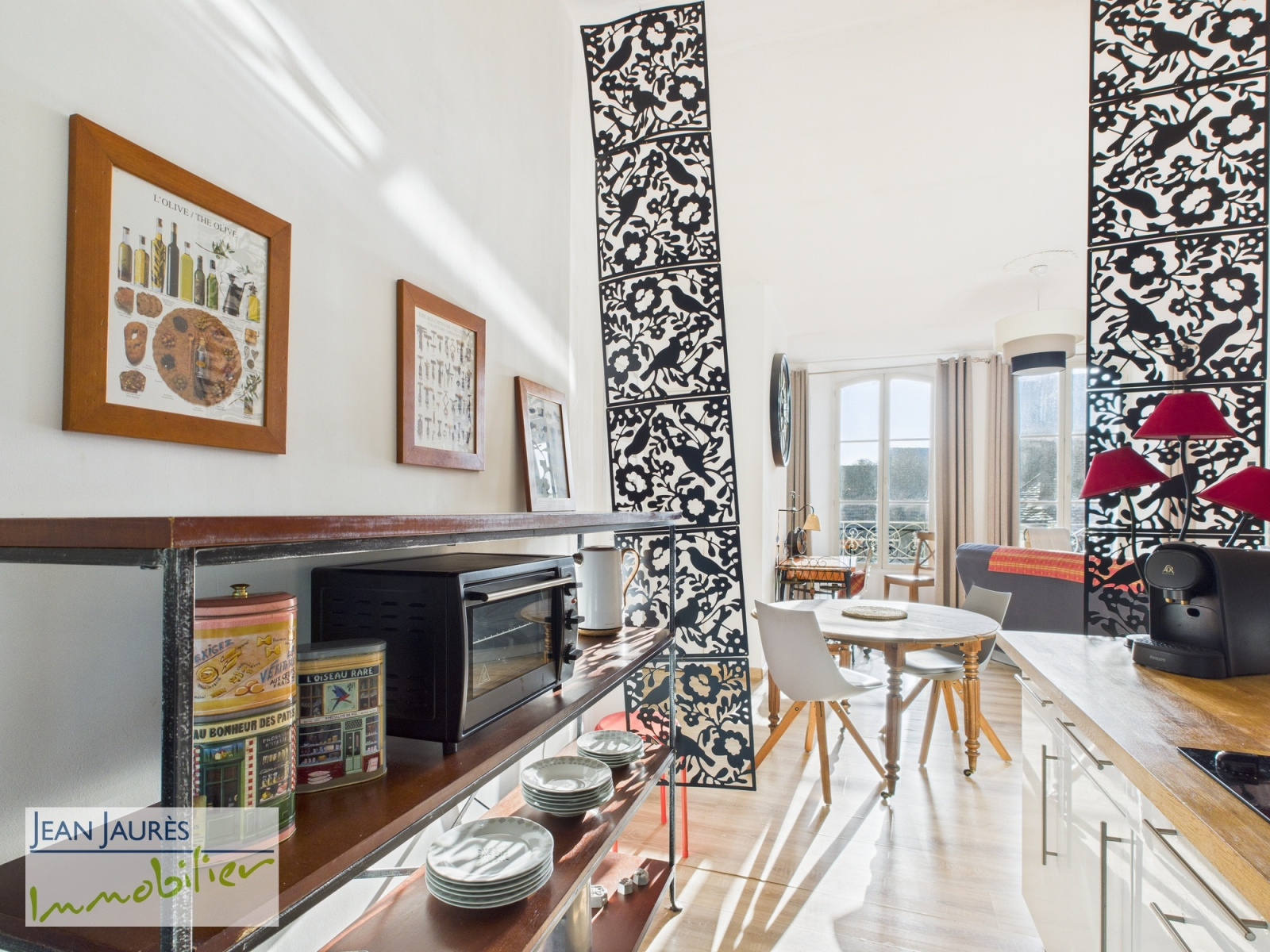 Cuisine équipée ouverte sur un lumineux espace de vie de caractère, salle de douche, WC et rangements.